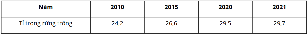 - Diện tích rừng trồng giai đoạn 2010 – 2021 tăng liên tục, tăng từ 24,2% năm 2010 đã tăng lên 29,7% năm 2021, tăng 5,5%.