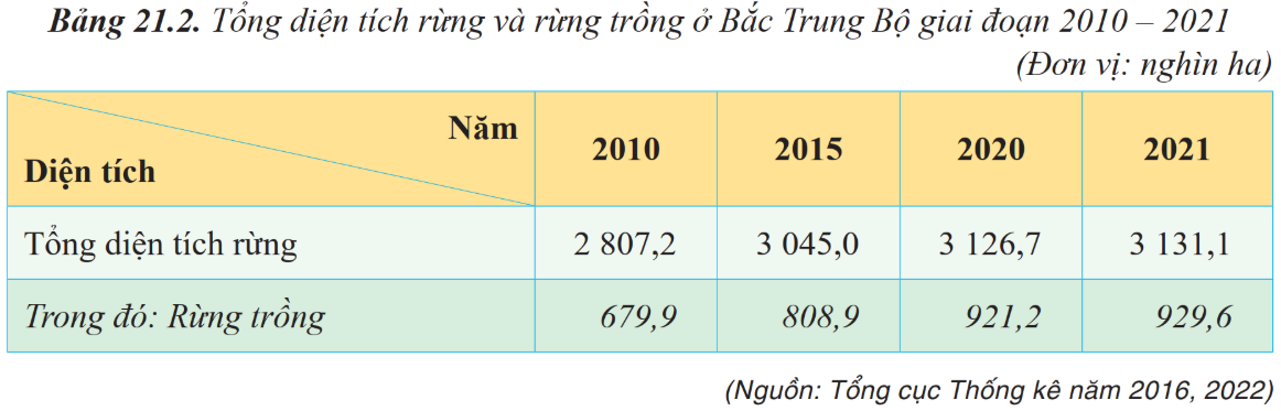 Luyện tập 1: Dựa vào bảng 21.2, hãy tính tỉ trọng diện tích rừng trồng trong tổng diện tích rừng của Bắc Trung Bộ giai đoạn 2010 – 2021. Nhận xét.