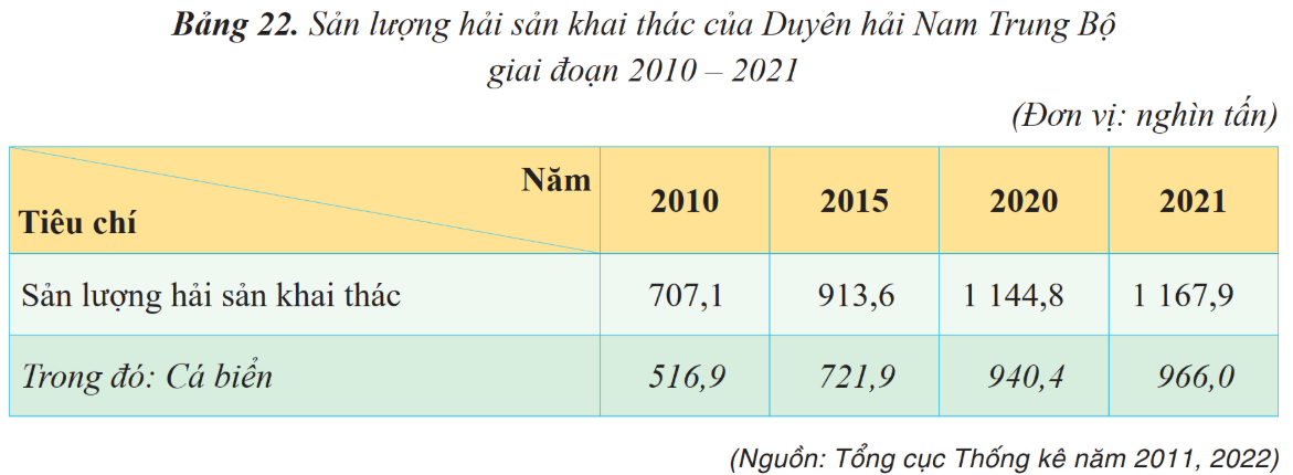 - Nhận xét: Nhìn chung tổng sản lượng hải sản khai thác ở Duyên hải Nam Trung Bộ trong giai đoạn 2010 – 2021 tăng liên tục, trong đó sản lượng cá biển khai thác luôn chiếm sản lượng nhiều nhất và cũng tăng liên tục trong giai đoạn này, cụ thể: