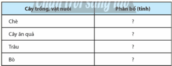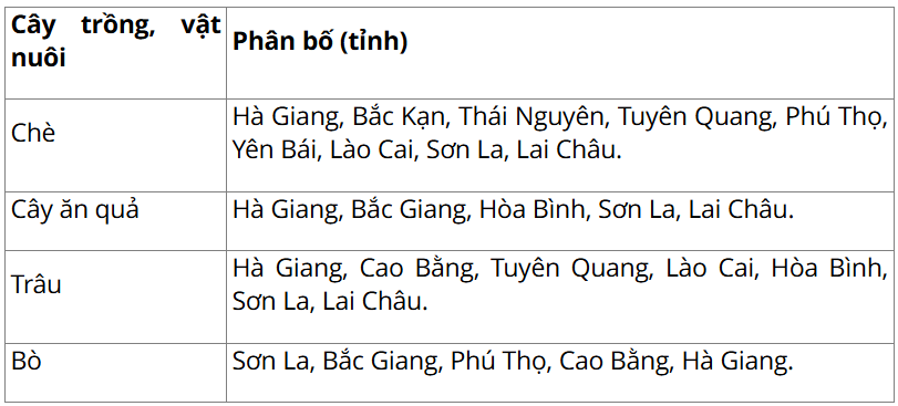 Dựa vào hình 24.2, xác định sự phân bố một số cây trồng, vật nuôi ở vùng Trung du và miền núi Bắc Bộ, hoàn thành thông tin theo bảng dưới đây vào vở: