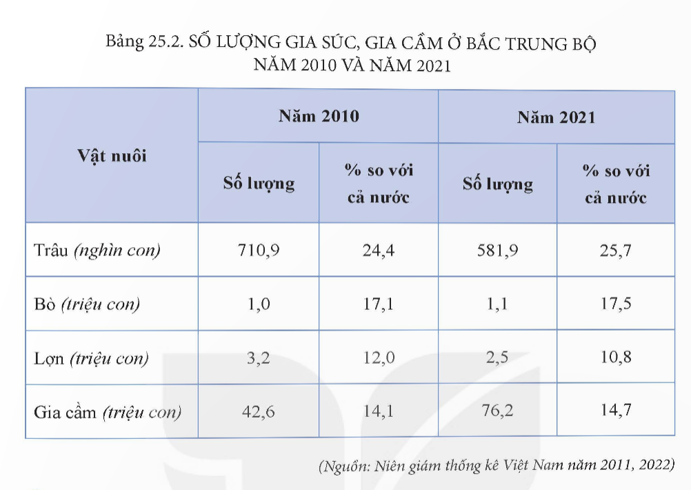 Luyện tập 1: Dựa vào bảng 25.2, hãy phân tích tình hình phát triển ngành chăn nuôi Bắc Trung Bộ giai đoạn 2010 – 2021.