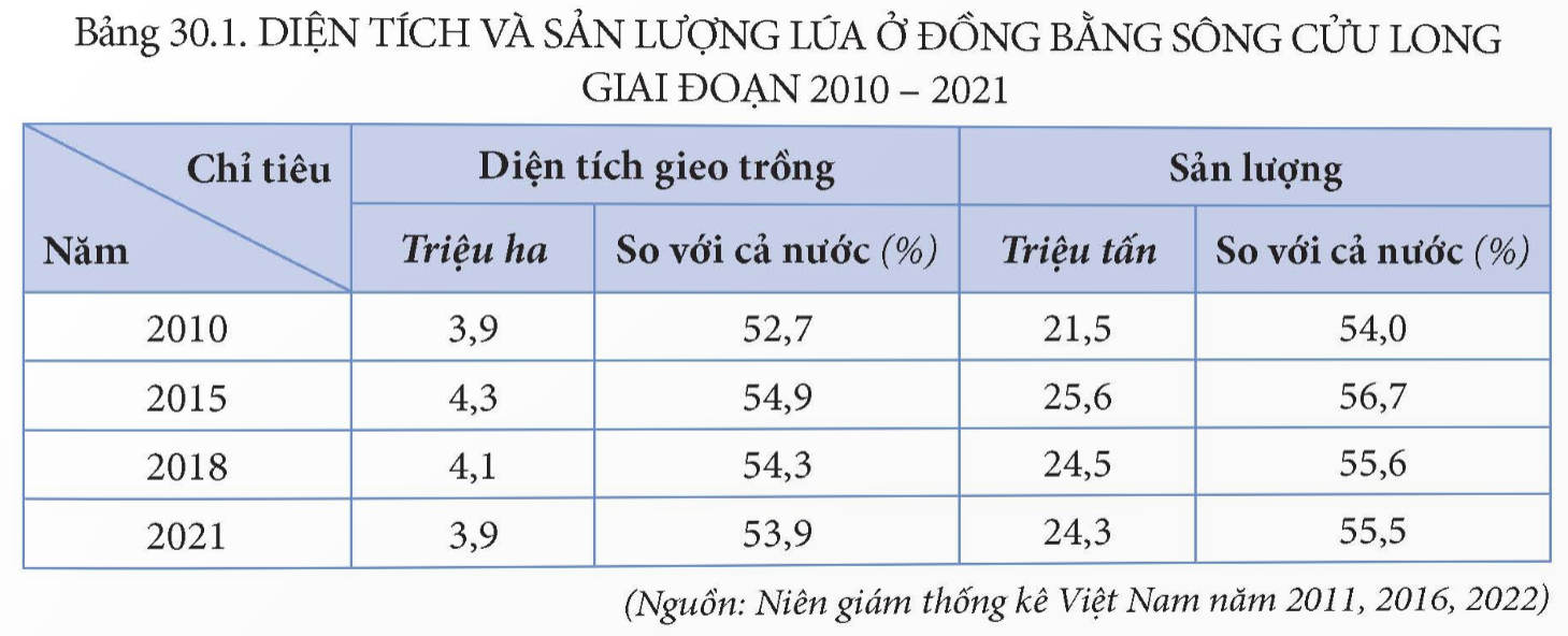 Luyện tập: Dựa vào bảng 30.1, hãy nhận xét tình hình và vai trò của ngành sản xuất lúa ở vùng Đồng bằng sông Cửu Long.