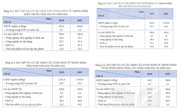 Luyện tập: Lựa chọn từ các bảng 32.1, 32.2, 32.3, 32.4, vẽ biểu đồ thể hiện cơ cấu GRDP năm 2010 và năm 2021 của một trong bốn vùng kinh tế trọng điểm. Nhận xét và giải thích cơ cấu GRDP của vùng kinh tế trọng điểm đó.