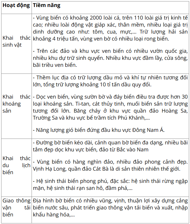 Luyện tập: Lập bảng về tiềm năng khai thác biển, đảo ở nước ta theo mẫu sau vào vở ghi bài: