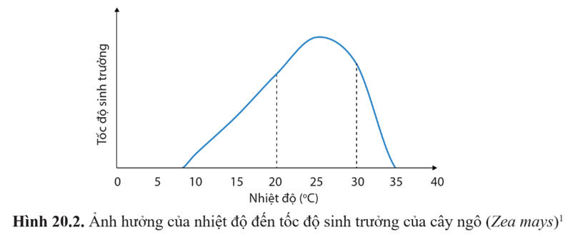 Luyện tập 1: Quan sát hình 20.2 và cho biết khoảng thuận lợi và điểm tới hạn về nhiệt độ đối với sự sinh trưởng của cây ngô (Zea mays).
