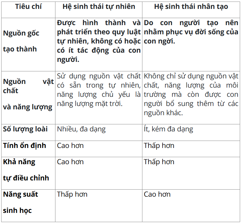 Câu hỏi 2: Phân biệt hệ sinh thái tự nhiên và hệ sinh thái nhân tạo. Nêu một số ví dụ về hệ sinh thái tự nhiên và hệ sinh thái nhân tạo.