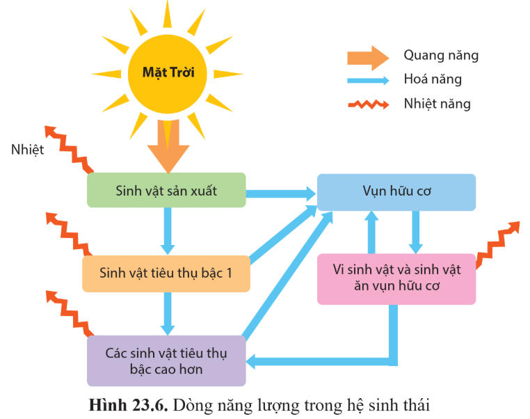 - Năng lượng từ ánh sáng mặt trời được chuyển hóa thành năng lượng hóa học nhờ các sinh vật sản xuất. Thông qua lưới thức ăn, năng lượng hóa học được chuyển qua các sinh vật trong hệ sinh thái. Cuối cùng, năng lượng được thải ra môi trường dưới dạng nhiệt.