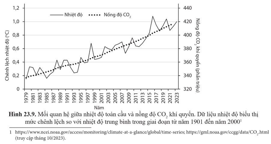 - Nếu trong 10 năm tới nồng độ CO2 tiếp tục biến đổi theo xu hướng như trong hình 23.9 thì nhiệt độ trung bình toàn cầu sẽ tăng.