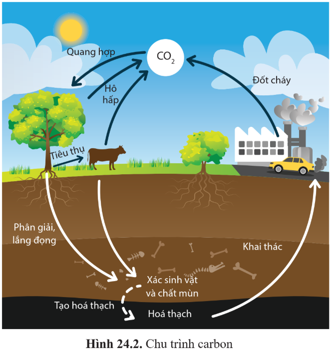 Câu hỏi 3: Quan sát hình 24.2 và trình bày khái quát chu trình carbon.