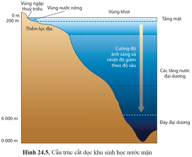 Câu hỏi 7: Dựa vào thông tin trong hình 24.5, hãy dự đoán tầng nước nào ở đại dương có nhiều thực vật phù du sinh sống nhất.
