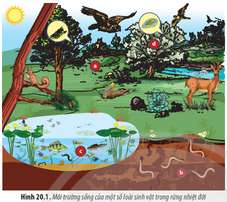 Câu hỏi 1: Quan sát Hình 20.1, hãy xác định các chú thích a, b, c, d tương ứng với loại môi trường sống nào. Cho ví dụ một số loài sinh vật sống ở mỗi loại môi trường đó.