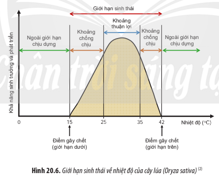 - Tác động của quy luật giới hạn sinh thái lên đời sống của cây lúa: Trong khoảng thuận lợi, cây lúa sinh trưởng và phát triển mạnh, đến khoảng chống chịu, cây lúa phát triển chậm dần và ngoài giới hạn sinh thái, cây lúa không thể phát triển được và chết.