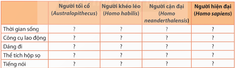 - Các đặc điểm nào chứng tỏ loài người hiện nay (H. sapiens) đã tiến hoá từ loài vượn người (Australopithecus) qua các giai đoạn trung gian.