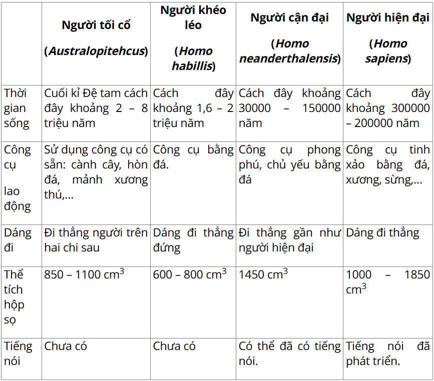 - Các đặc điểm chứng tỏ loài người hiện nay (H. sapiens) đã tiến hóa từ loài vượn người (Australopithecus) qua các giai đoạn trung gian: có dáng đi thẳng có ngón tay cái to dài và linh hoạt giống với người hiện đại, biết sử dụng công cụ lao động.