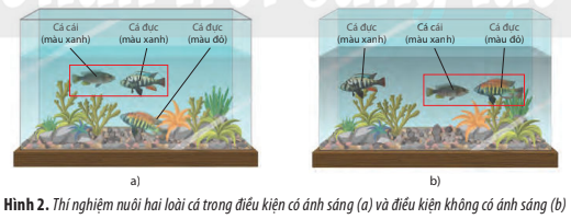 Bài tập 4: Ở hai loài cá cùng chi, các con cái có xu hướng chọn bạn tình dựa vào màu sắc của con đực ở thời kì sinh sản. Trong đó, con đực của loài Pundamilia pundamilia có lưng màu xanh nhạt, còn con đực của loài Pundamilia nyererei có lưng màu đỏ nhạt. Khi nuôi các con đực và cái của hai loài này trong hai bể cá (Hình 2); kết quả cho thấy trong bể ở điều kiện có ánh sáng, cá cái chỉ giao phối với cá đực cùng loài, còn trong bể không có ánh sáng xảy ra hiện tượng cá cái giao phối với cá đực của loài khác.