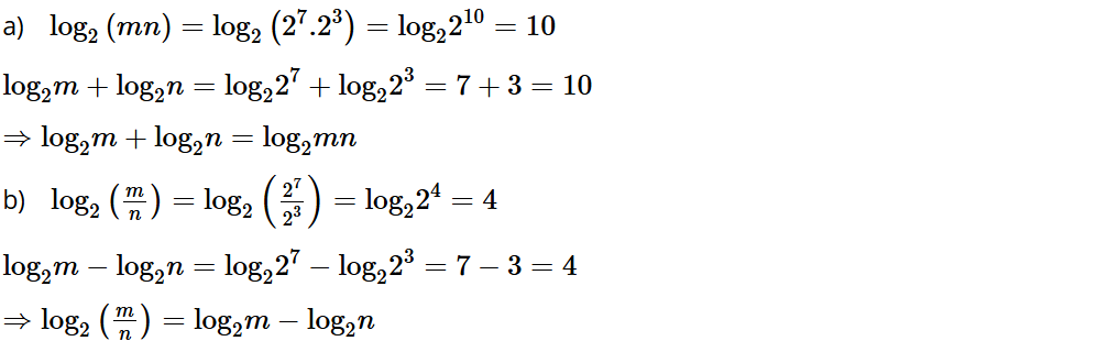 a) Tính log2(mn); log2m + log2n và so sánh các kết quả đó.
