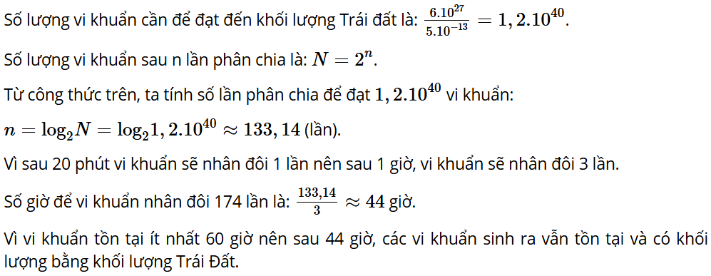 Bài tập 6: Một vi khuẩn có khối lượng khoảng 5 . 10–13 gam và cứ 20 phút vi khuẩn đó tự nhân đôi một lần (Nguồn: Câu hỏi và bài tập vi sinh học, NXB ĐHSP, 2008). Giả sử các vi khuẩn được nuôi trong các điều kiện sinh trưởng tối ưu và mỗi con vi khuẩn đều tồn tại trong ít nhất 60 giờ. Hỏi sau bao nhiêu giờ khối lượng do tế bào vi khuẩn này sinh ra sẽ đạt tới khối lượng của Trái Đất (lấy khối lượng của Trái Đất là 6 . 1027 gam) (làm tròn kết quả đến hàng đơn vị)?