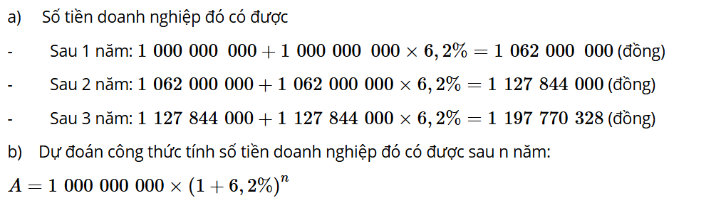 Số tiền doanh nghiệp đó có được (cả gốc và lãi) sau n năm là: A = 1 000 000 000 . (1 + 6,2%)n.