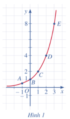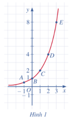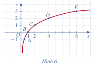 b) Các điểm A(0,5; –1), B(1; 0), C(2; 1); D(4; 2) và E(8; 3) được biểu diễn trên mặt phẳng tọa độ Oxy như Hình 6.