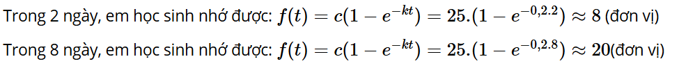 Bài tập 5: Các nhà tâm lí học sử dụng mô hình hàm số mũ để mô phỏng quá trình học tập của một học sinh như sau: f(t) = c(1 – e–kt), trong đó c là tổng số đơn vị kiến thức học sinh phải học, k (kiến thức/ngày) là tốc độ tiếp thu của học sinh, t (ngày) là thời gian học và f(t) là số đơn vị kiến thức học sinh đã học được (Nguồn: R.I. Charles et al., Algebra 2, Pearson). Giả sử một em học sinh phải tiếp thu 25 đơn vị kiến thức mới. Biết rằng tốc độ tiếp thu của em học sinh là k = 0,2. Hỏi em học sinh sẽ học được (khoảng) bao nhiêu đơn vị kiến thức mới sau 2 ngày? Sau 8 ngày? (Làm tròn kết quả đến hàng đơn vị).