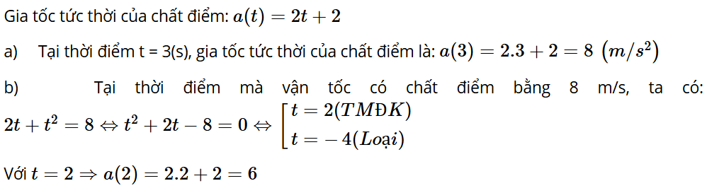 Bài tập 5: Vận tốc của một chất điểm chuyển động được biểu thị bởi công thức v(t) = 2t + t2, trong đó t > 0, t tính bằng giây và v(t) tính bằng m/s. Tìm gia tốc tức thời của chất điểm: