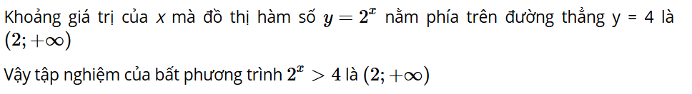 Cho đồ thị của các hàm số y = 2x và y = 4 như Hình 6.7. Tìm khoảng giá trị của x mà đồ thị hàm số y = 2x nằm phía trên đường thẳng y = 4 và từ đó suy ra tập nghiệm của bất phương trình 2x > 4.