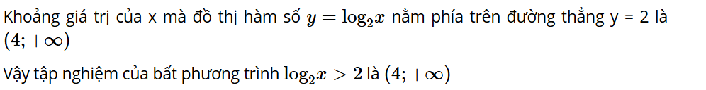 Cho đồ thị của các hàm số y = log2x và y = 2 như Hình 6.8. Tìm khoảng giá trị của x mà đồ thị hàm số y = log2x nằm phía trên đường thẳng y = 2 và từ đó suy ra tập nghiệm của bất phương trình log2 x > 2.