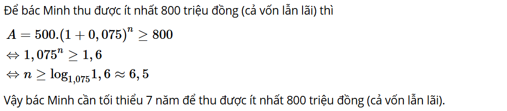 Tính thời gian tối thiểu gửi tiết kiệm để bác Minh thu được ít nhất 800 triệu đồng (cả vốn lẫn lãi).