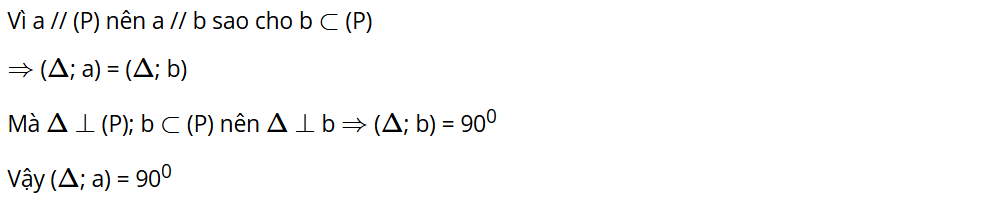 Vì nếu trái lại thì ∆ song song hoặc nằm trên (P). Khi đó, có đường thẳng a thuộc (P) và song song với ∆. Do đó (∆, a) = 0°, điều này mâu thuẫn với giả thiết ∆ vuông góc với (P).