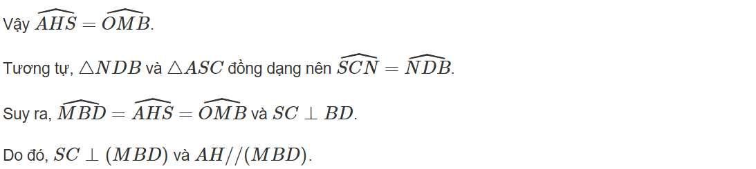 Luyện tập 4: Cho hình chóp S.ABCD có đáy ABCD là một hình vuông, SA ⊥ (ABCD). Kẻ AH vuông góc với SC (H thuộc SC), BM vuông góc với SC (M thuộc SC). Chứng minh rằng SC ⊥ (MBD) và AH // (MBD).