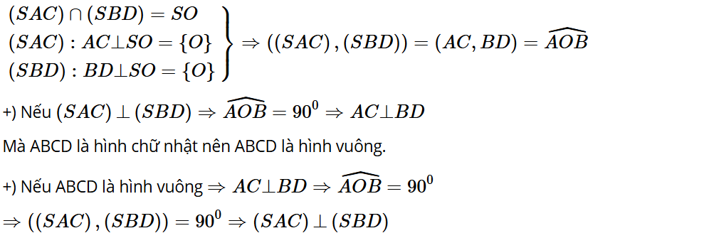 Luyện tập 1: Cho hình chóp S.ABCD, đáy ABCD là một hình chữ nhật có tâm O, SO ⊥ (ABCD). Chứng minh rằng hai mặt phẳng (SAC) và (SBD) vuông góc với nhau khi và chỉ khi ABCD là một hình vuông.
