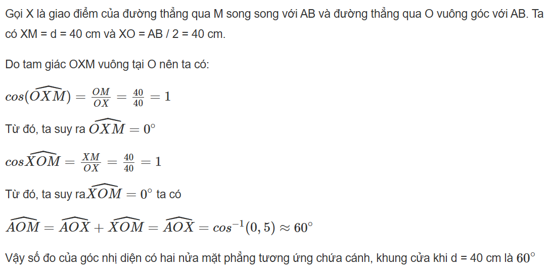 Vận dụng 1: Trong cửa sổ ở Hình 7.56, cánh và khung cửa là các nửa hình tròn có đường kính 80 cm, bản lề được đính ở điểm chính giữa O của các cung tròn khung và cánh cửa. Khi cửa mở, đường kính của khung và đường kính của cánh song song với nhau và cách nhau một khoảng d; khi cửa đóng, hai đường kính đó trùng nhau. Hãy tính số đo của góc nhị diện có hai nửa mặt phẳng tương ứng chứa cánh, khung cửa khi d = 40 cm.