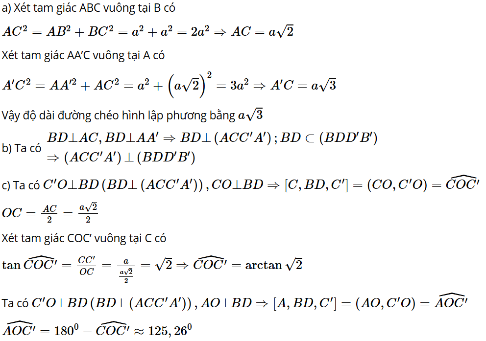 c) Gọi O là tâm của hình vuông ABCD. Chứng minh rằng là một góc phẳng của góc nhị diện [C, BD, C']. Tính (gần đúng) số đo của các góc nhị diện [C, BD, C'], [A, BD,C'].