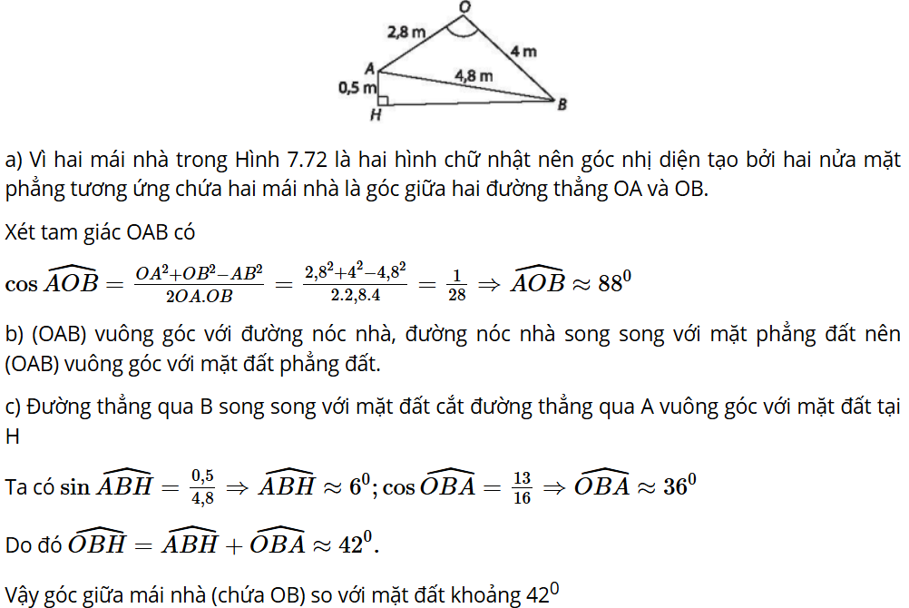 Bài 7.20: Hai mái nhà trong Hình 7.72 là hai hình chữ nhật. Giả sử AB = 4,8 m; OA = 2,8 m; OB = 4 m.