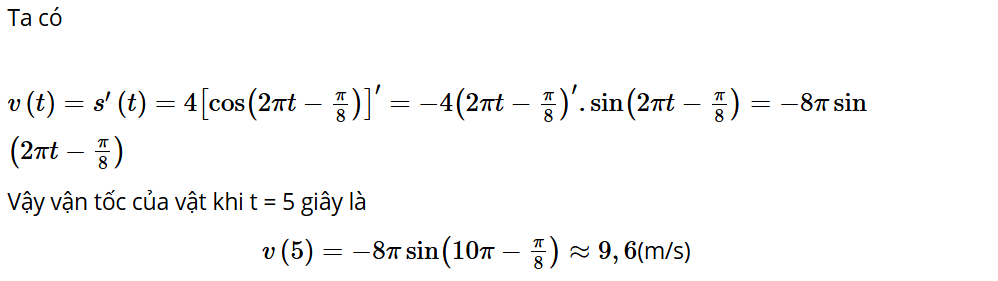 Vận dụng 1: Một vật chuyển động có phương trình s(t) = 4cos (m), với t là thời gian tính bằng giây. Tính vận tốc của vật khi t = 5 giây (làm tròn kết quả đến chữ số thập phân thứ nhất).