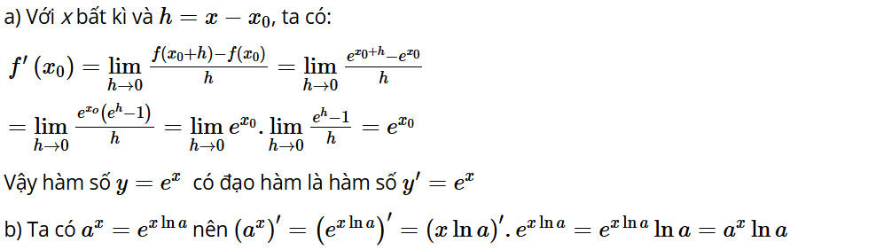 a) Sử dụng giới hạn và đẳng thức ex + h – ex = ex(eh – 1), tính đạo hàm của hàm số y = ex tại x bằng định nghĩa.