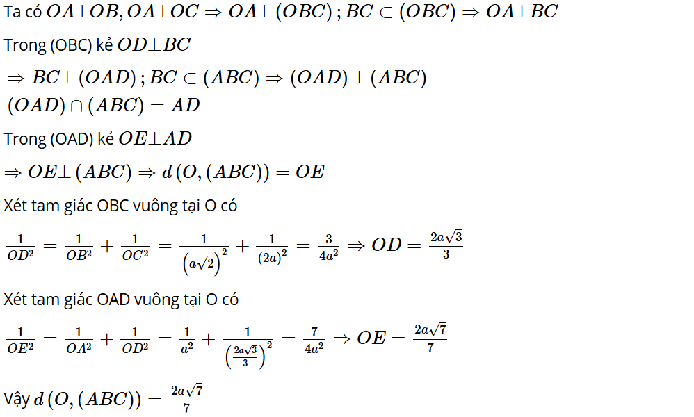 Bài 7.38: Cho tứ diện OABC có OA, OB, OC đôi một vuông góc với nhau và OA = a, OB = a và OC = 2a. Tính khoảng cách từ điểm O đến mặt phẳng ABC.