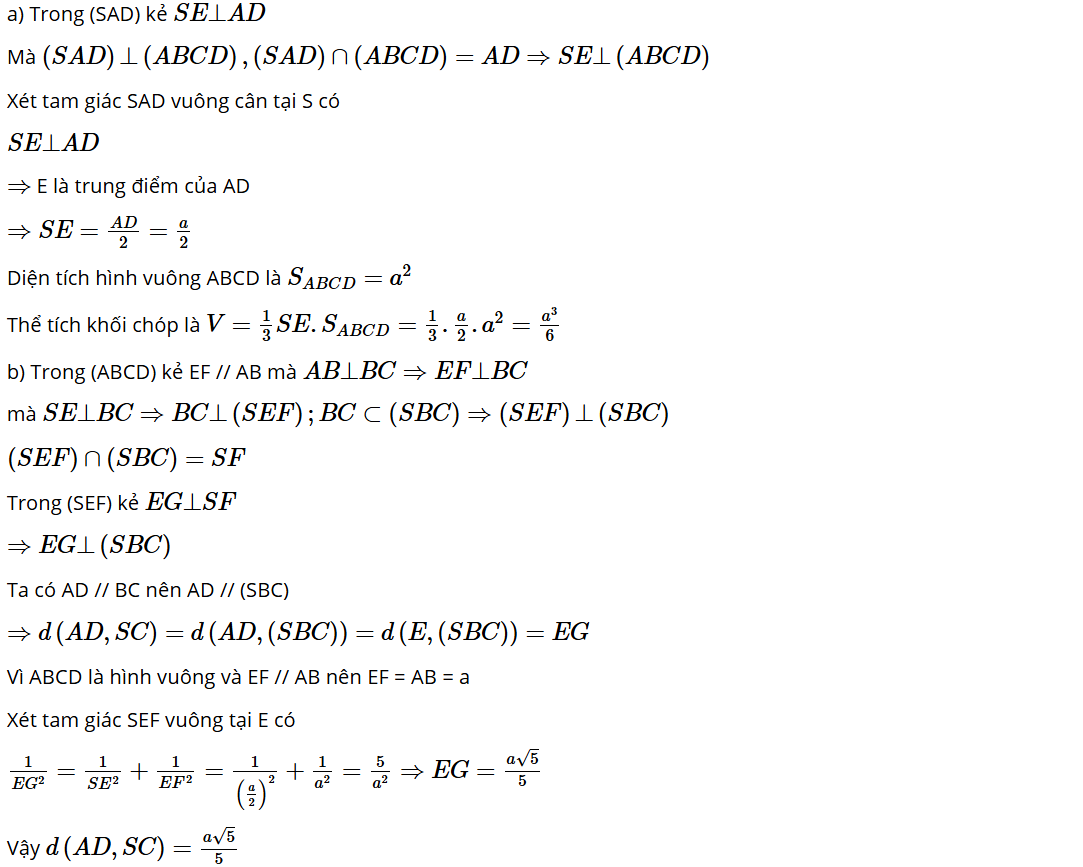 Bài 7.41: Cho hình chóp S.ABCD có đáy ABCD là hình vuông cạnh bằng a. Biết tam giác SAD vuông cân tại S và (SAD) (ABCD).