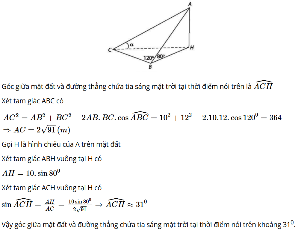 Bài 7.45: Trên mặt đất phẳng, người ta dựng một cây cột AB có chiều dài bằng 10 m và tạo với mặt đất góc 80°. Tại một thời điểm dưới ánh sáng mặt trời, bóng BC của cây cột trên mặt đất dài 12 m vào tạo với cây cột một góc bằng 120° (tức là = 120o). Tính góc giữa mặt đất và đường thẳng chứa tia sáng mặt trời tại thời điểm nói trên.